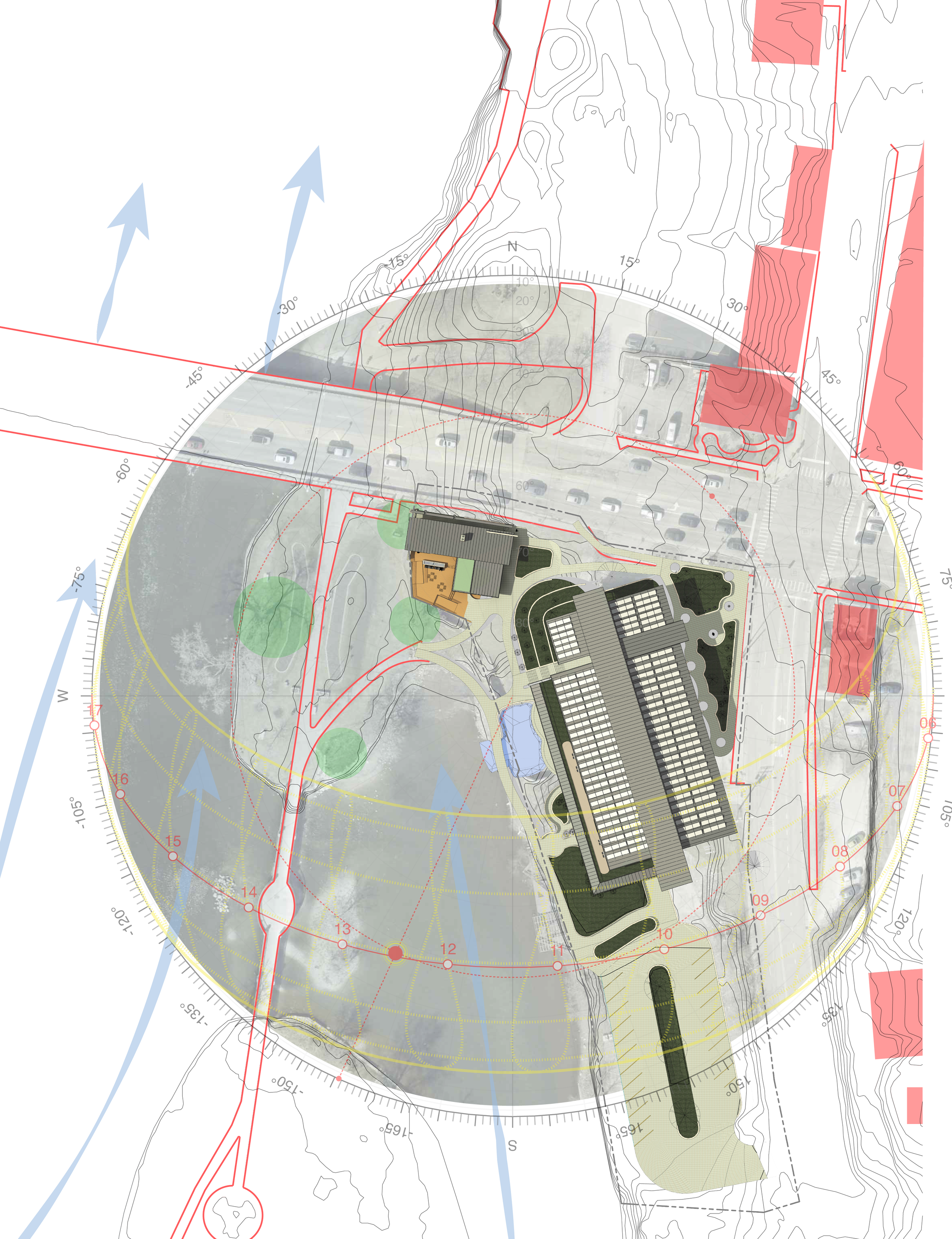 My design focuses on an integrated approach to bioclimatic architecture, utilizing a “stack” of passive and active strategies to achieve near net-zero performance. By orienting the primary massing toward the southwest, the building balances renewable energy generation from the photovoltaic array with the use of deep overhangs and sunshades to mitigate intense solar heat gain, particularly on the western facade. This orientation allows the structure to capture peak afternoon solar energy while the physical shading devices prevent the interior from reaching uncomfortable thermal levels during the hottest parts of the day.